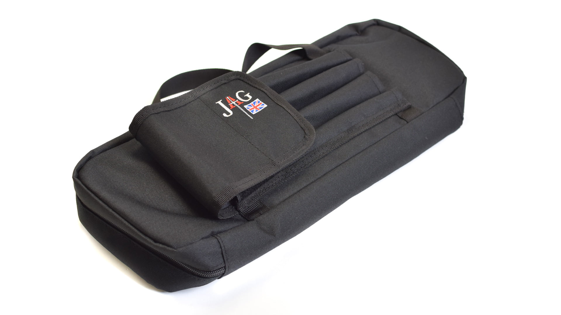 Dies ist ein kompaktes Buzzerbar Bag für die Unterbringung von 3er Buzzerbars, Zubehör, Banksticks und sogar der Basis des Super Compact Pods oder des Micro Pods. Die Buzzerbars und Zubehör können sicher im Inneren der Tasche untergebracht werden. Es gibt ein Trennfach, was die beiden Buzzerbars gegeneinander schützt. Ein zusätzliches Fach nimmt Zubehör wie Stabiliser, Einhängebissanzeiger oder Stage Stands auf. Außen können die Banksticks untergebracht werden. Die Enden der Fächer für die Banksticks sind unten offen, so dass auch lange Banksticks hineinpassen. Zwei stabile Tragegriffe machen den Transport sicher und einfach.