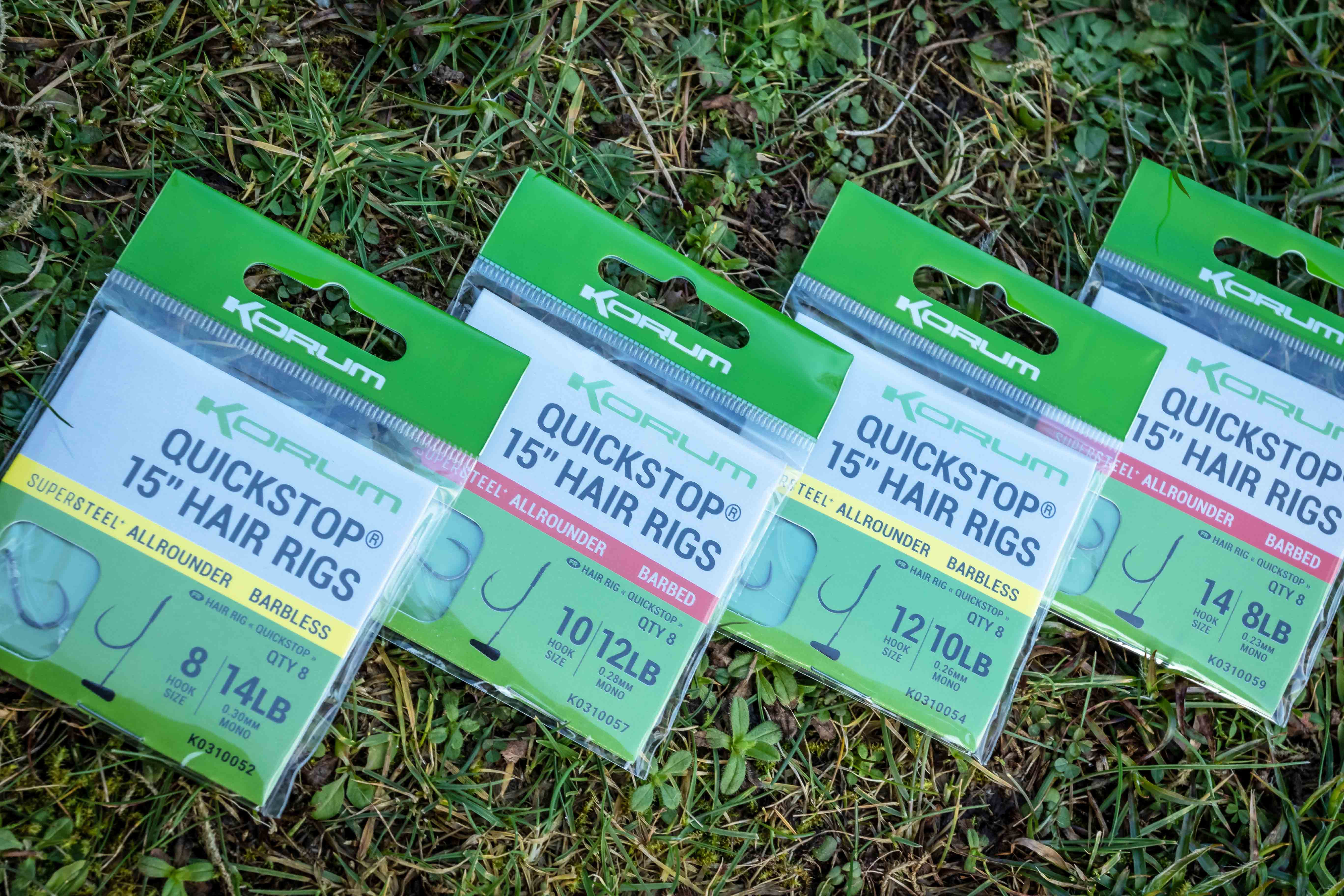 Korum 15-Inch Big Fish Hair Rigs with Quickstops Barbless. In den Hakengrößen 8, 10, 12 und 14.